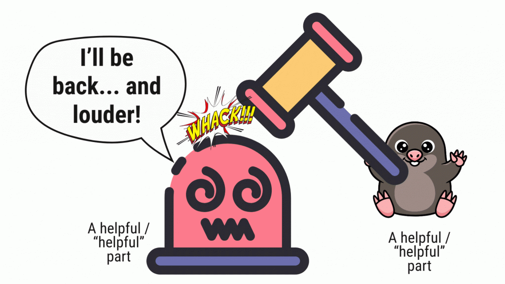 These parts are going to try to help/”help” you (where the quotes indicate their help is not actually helpful) no matter what. This mostly likely me: They’ll be back!