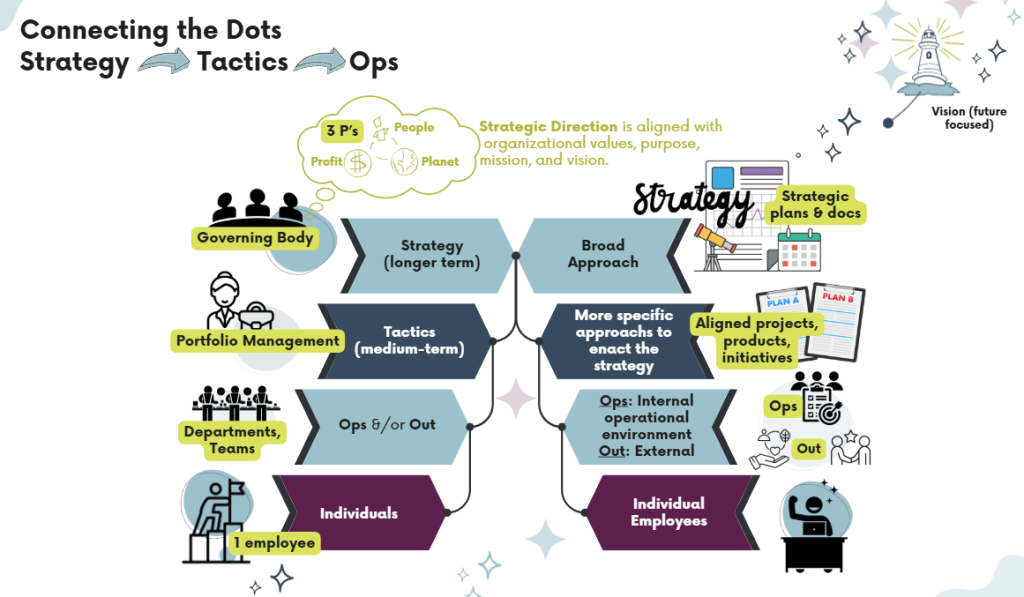 At the tactical level, managers align value propositions, revenue logics, and partnerships within each model. Tactics are the means by which a strategy is enacted. From an organizational and portfolio perspective, projects are tactical. Additionally at the operations level, teams optimize processes and local experiments.